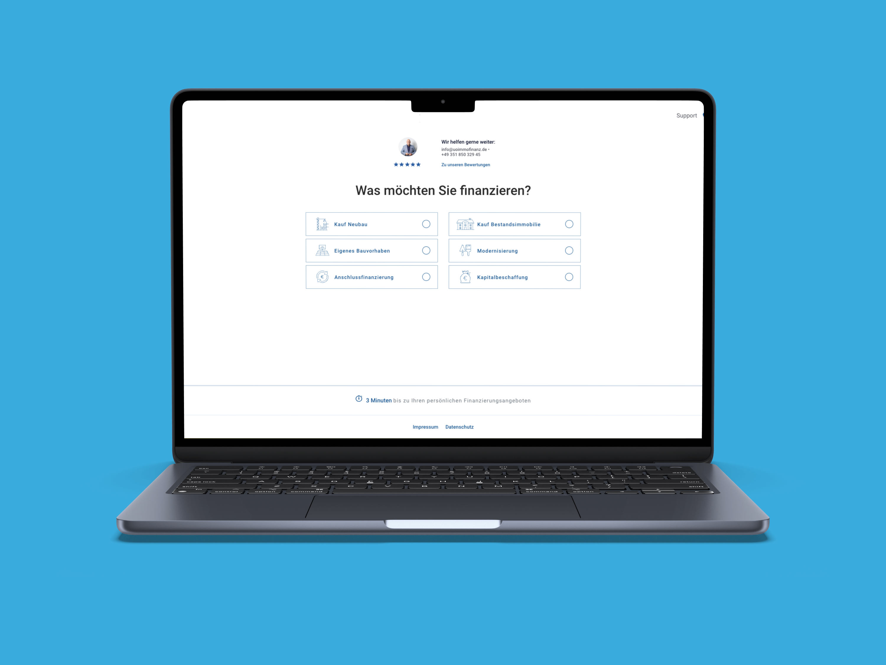 Formular- sowie Rechner-Leads werden per Webhook an FinLink übergeben, wo sie automatisch dem zuständigen Berater zugeordnet werden. Status-Updates laufen bidirektional zurück auf die Website und informieren Kunden transparent über den Fortschritt – das spart durchschnittlich acht Minuten manuellen Aufwand pro Anfrage.