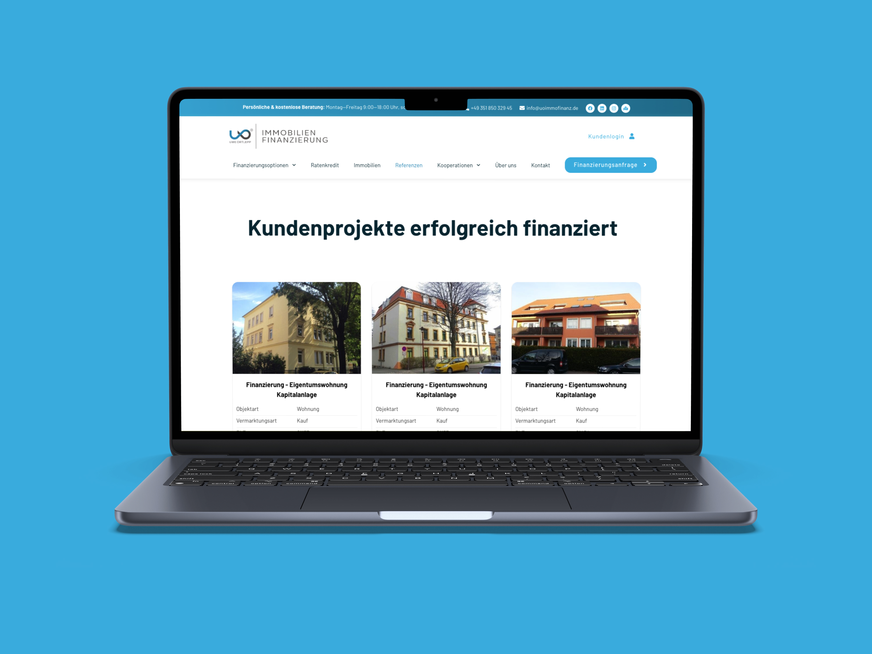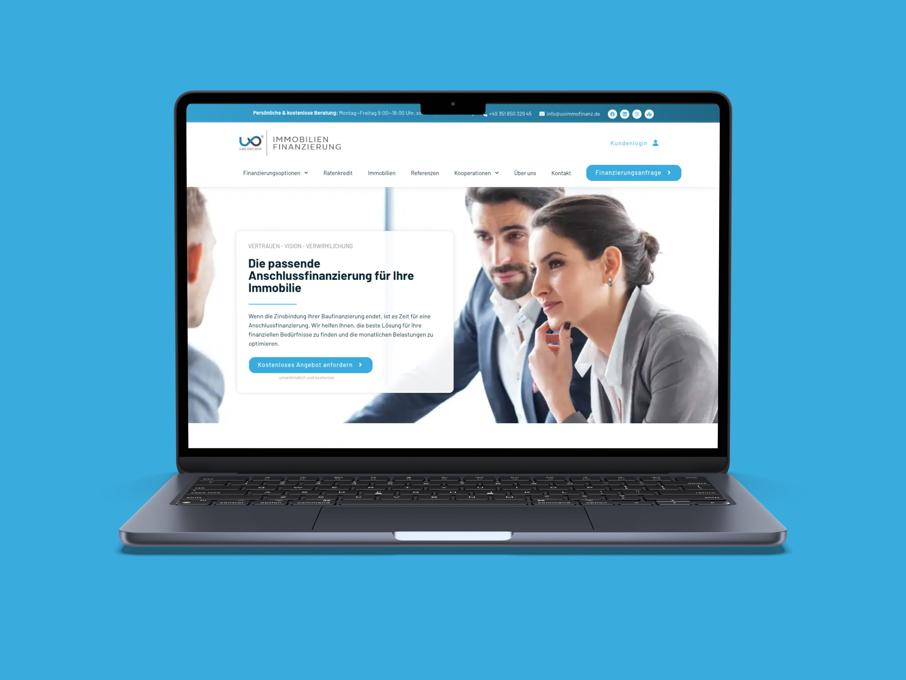MORE. übersetzte die Kernwerte von UO Immo Finanz – Vertrauen, Vision, Verwirklichung – in ein modernes UI mit TÜV-Siegeln, ProvenExpert-Ratings und persönlichen Berater-Profilen. Das neue Design senkte die Bounce-Rate um 37 %* und verlängerte die durchschnittliche Sitzungsdauer um 52 %*.